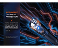 - Salida máxima de 1700 lúmenes y distancia de haz de 267 metros, utiliza un LED Luminus SST40 con una vida útil de 50.000 horas.